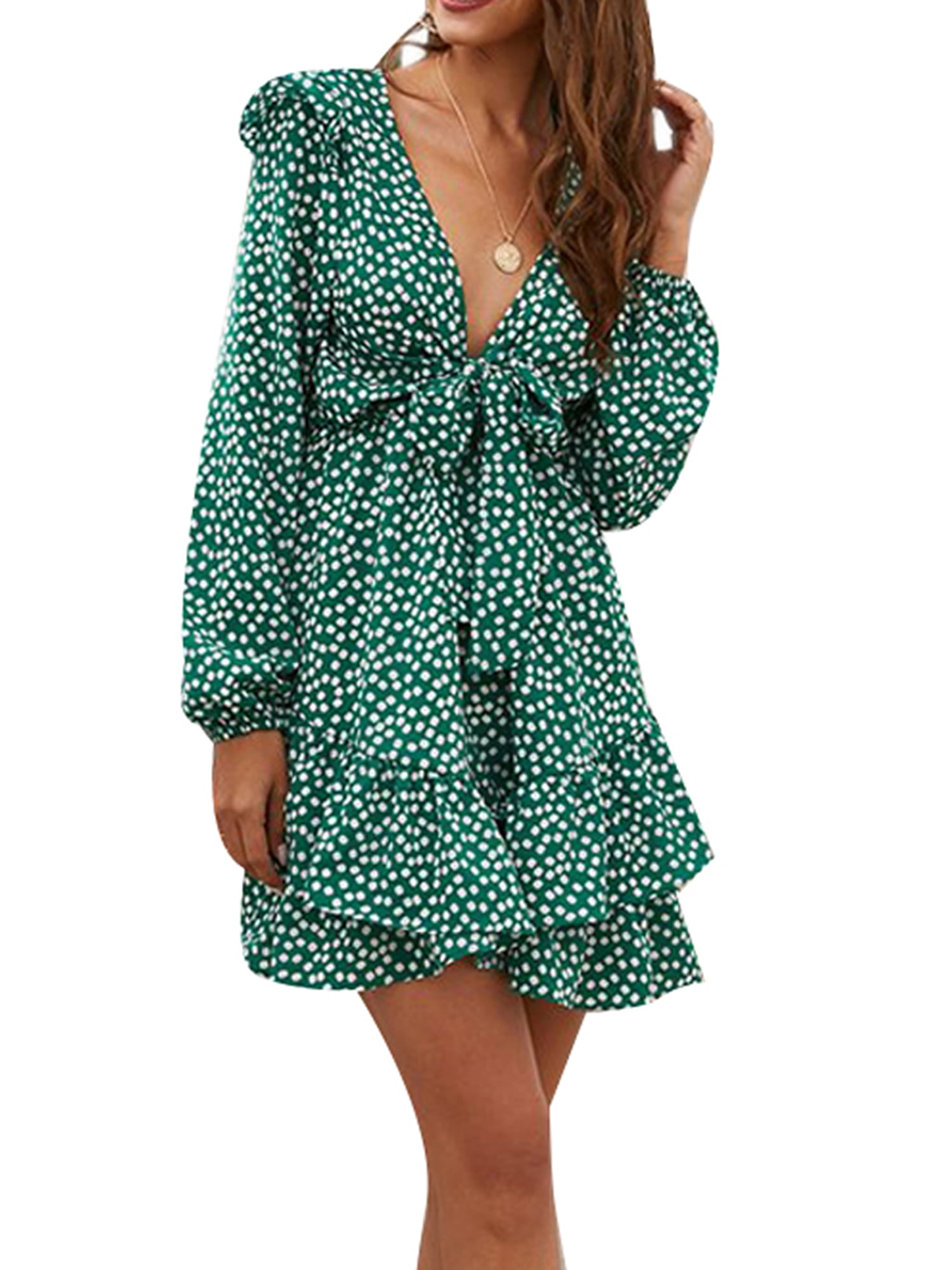 Female Dress Floral Print Deep V Neck Long Sleeve Dress One Piece For Women Green White Walmart Com
